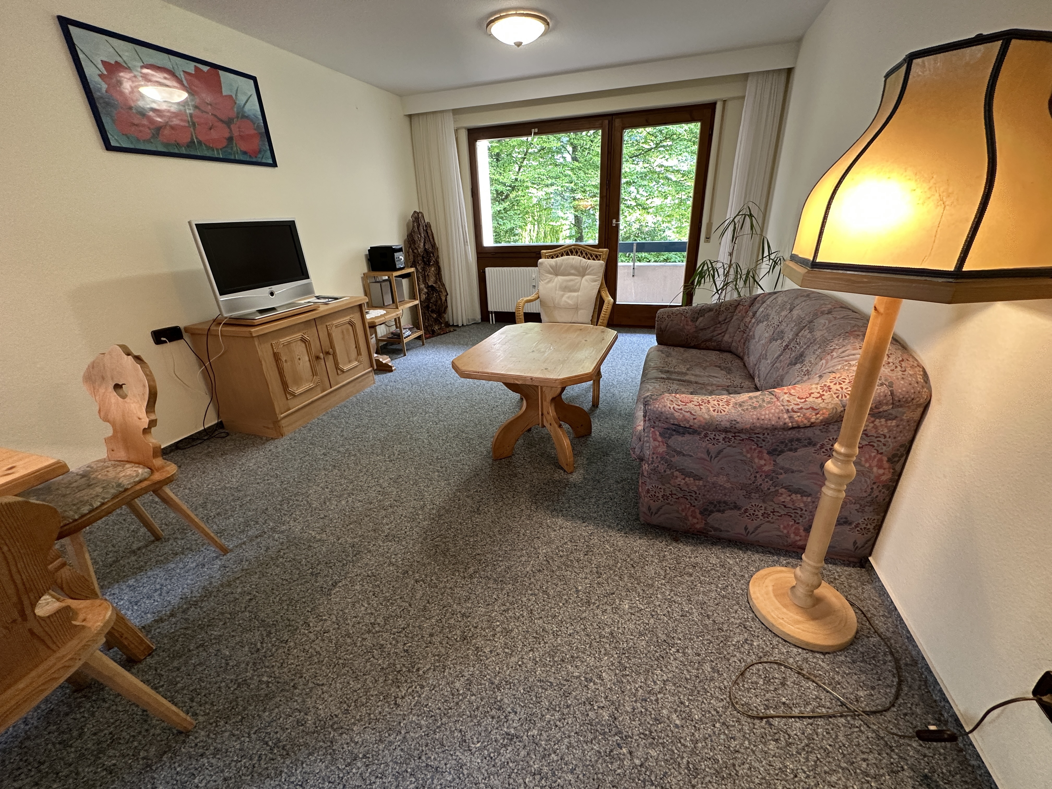 Vom Flur aus gelangen Sie geradeaus in das komplett möblierte Wohn/-Esszimmer mit integrierter Küche und Zugang zum Balkon. Vom Balkon hat man einen schönen Blick ins Grüne. Hier kann man wunderbar entspannen und vom Alltag abzuschalten.